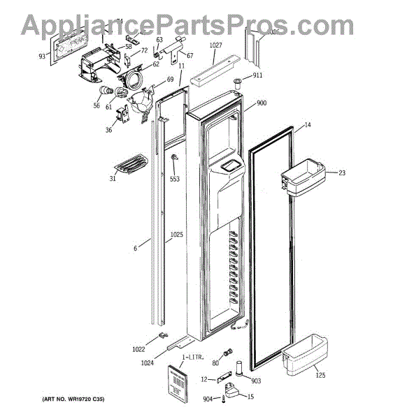 The Ice Door Assembly is an OEM part for GE refrigerators. It is integral to the ice dispenser system, controlling access to the ice chute. This component ensures the efficient delivery of ice cubes or crushed ice when activated and seals off the chute when not in use to maintain the freezer's temperature and prevent frost buildup.