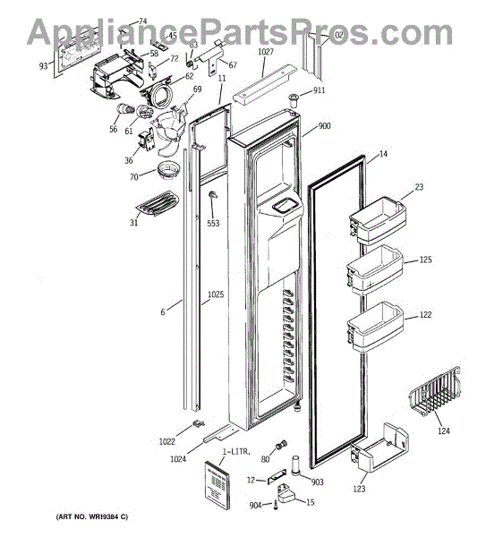 The Ice Door Assembly is an OEM part for GE refrigerators. It is integral to the ice dispenser system, controlling access to the ice chute. This component ensures the efficient delivery of ice cubes or crushed ice when activated and seals off the chute when not in use to maintain the freezer's temperature and prevent frost buildup.
