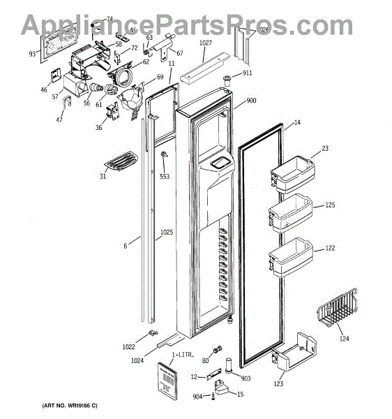 The Ice Door Assembly is an OEM part for GE refrigerators. It is integral to the ice dispenser system, controlling access to the ice chute. This component ensures the efficient delivery of ice cubes or crushed ice when activated and seals off the chute when not in use to maintain the freezer's temperature and prevent frost buildup.