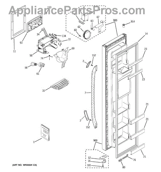 The Door Recess Spring is an OEM replacement part for GE side-by-side refrigerators. It sits within the icemaker door frame to control movement and allow smooth closing/opening of the access point.