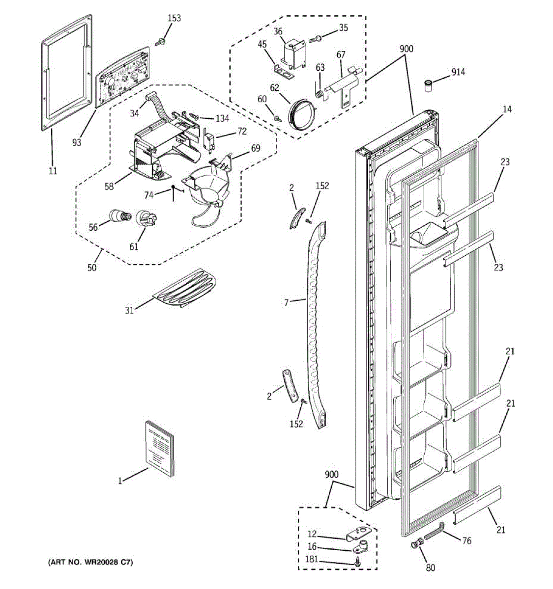 Ice dispenser door assembly seals the ice chute opening on your refrigerator. Replace if cracked, warped, or the rubber gasket is damaged and leaking air.