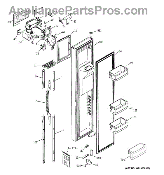 The Ice Door Assembly is an OEM part for GE refrigerators. It is integral to the ice dispenser system, controlling access to the ice chute. This component ensures the efficient delivery of ice cubes or crushed ice when activated and seals off the chute when not in use to maintain the freezer's temperature and prevent frost buildup.