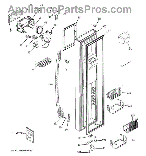 The Door Recess Spring is an OEM replacement part for GE side-by-side refrigerators. It sits within the icemaker door frame to control movement and allow smooth closing/opening of the access point.