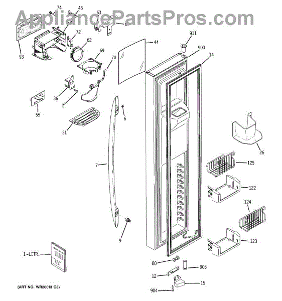 The Ice Door Assembly is an OEM part for GE refrigerators. It is integral to the ice dispenser system, controlling access to the ice chute. This component ensures the efficient delivery of ice cubes or crushed ice when activated and seals off the chute when not in use to maintain the freezer's temperature and prevent frost buildup.