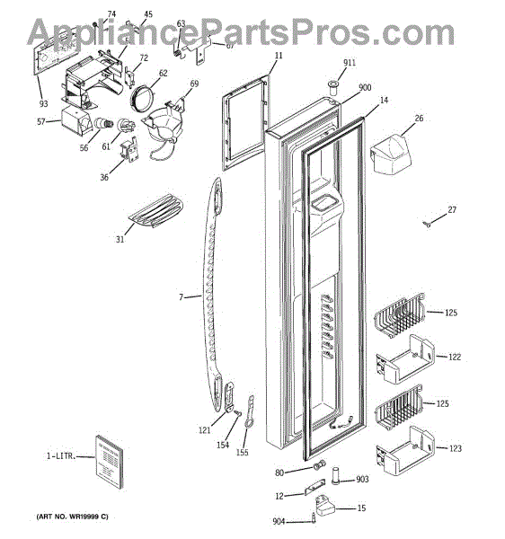 The Ice Door Assembly is an OEM part for GE refrigerators. It is integral to the ice dispenser system, controlling access to the ice chute. This component ensures the efficient delivery of ice cubes or crushed ice when activated and seals off the chute when not in use to maintain the freezer's temperature and prevent frost buildup.