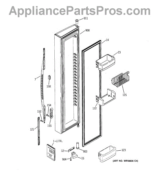 The Door Stop is an OEM component for GE refrigerator models. It is a small component located at the base of the refrigerator door that stops the door from opening past 90 degrees.