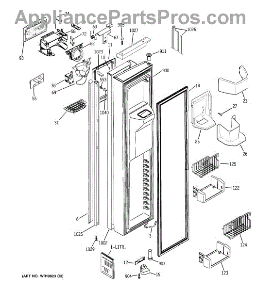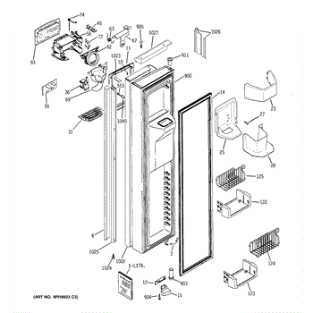 The Ice Door Assembly is an OEM part for GE refrigerators. It is integral to the ice dispenser system, controlling access to the ice chute. This component ensures the efficient delivery of ice cubes or crushed ice when activated and seals off the chute when not in use to maintain the freezer's temperature and prevent frost buildup.