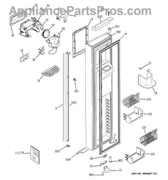 The Door Recess Spring is an OEM replacement part for GE side-by-side refrigerators. It sits within the icemaker door frame to control movement and allow smooth closing/opening of the access point.