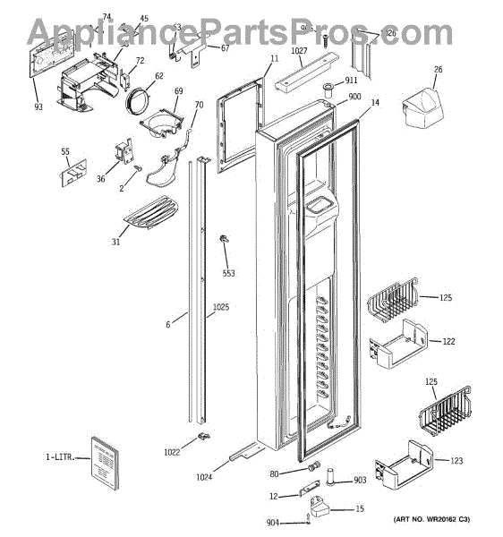 The Ice Door Assembly is an OEM part for GE refrigerators. It is integral to the ice dispenser system, controlling access to the ice chute. This component ensures the efficient delivery of ice cubes or crushed ice when activated and seals off the chute when not in use to maintain the freezer's temperature and prevent frost buildup.