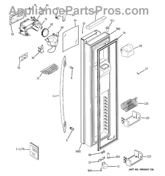 The Ice Door Assembly is an OEM part for GE refrigerators. It is integral to the ice dispenser system, controlling access to the ice chute. This component ensures the efficient delivery of ice cubes or crushed ice when activated and seals off the chute when not in use to maintain the freezer's temperature and prevent frost buildup.