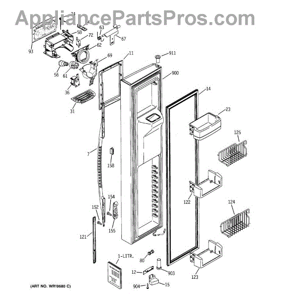This stop door is the dispenser closure that helps control and seal the ice/water opening so the dispenser stays closed when not in use. It restores proper sealing and prevents drafts or drips from the dispenser area. What it does: