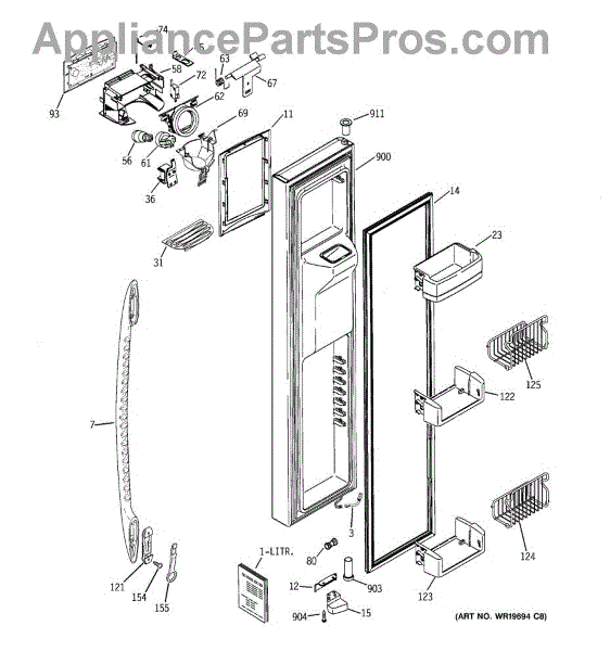 The Ice Door Assembly is an OEM part for GE refrigerators. It is integral to the ice dispenser system, controlling access to the ice chute. This component ensures the efficient delivery of ice cubes or crushed ice when activated and seals off the chute when not in use to maintain the freezer's temperature and prevent frost buildup.