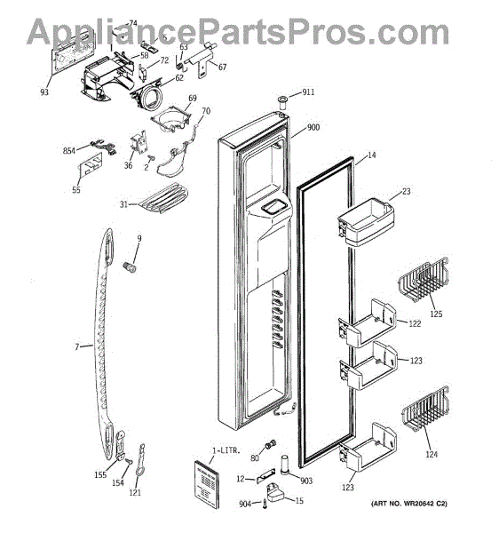 This stop door is the dispenser closure that helps control and seal the ice/water opening so the dispenser stays closed when not in use. It restores proper sealing and prevents drafts or drips from the dispenser area. What it does: