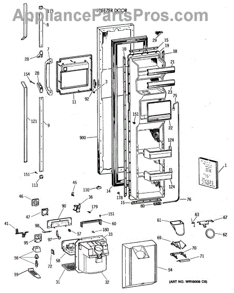 The Ice Door Assembly is an OEM part for GE refrigerators. It is integral to the ice dispenser system, controlling access to the ice chute. This component ensures the efficient delivery of ice cubes or crushed ice when activated and seals off the chute when not in use to maintain the freezer's temperature and prevent frost buildup.