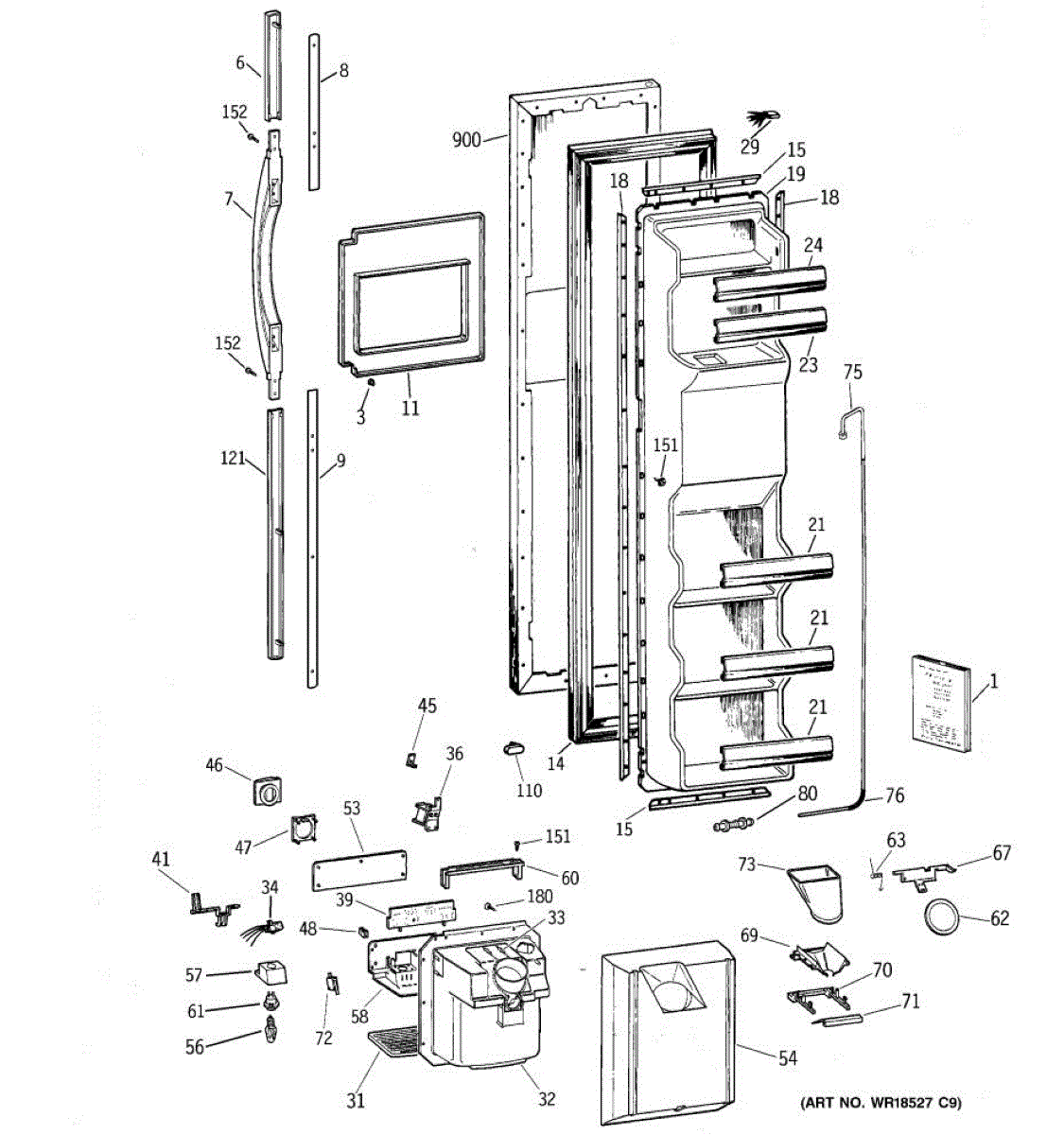 Ice dispenser door assembly seals the ice chute opening on your refrigerator. Replace if cracked, warped, or the rubber gasket is damaged and leaking air.