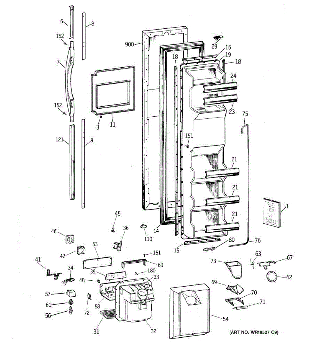 Ice dispenser door assembly seals the ice chute opening on your refrigerator. Replace if cracked, warped, or the rubber gasket is damaged and leaking air.