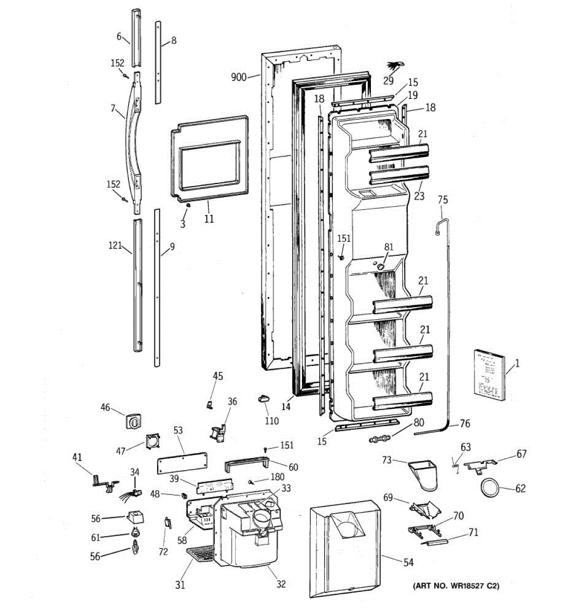 Ice dispenser door assembly seals the ice chute opening on your refrigerator. Replace if cracked, warped, or the rubber gasket is damaged and leaking air.