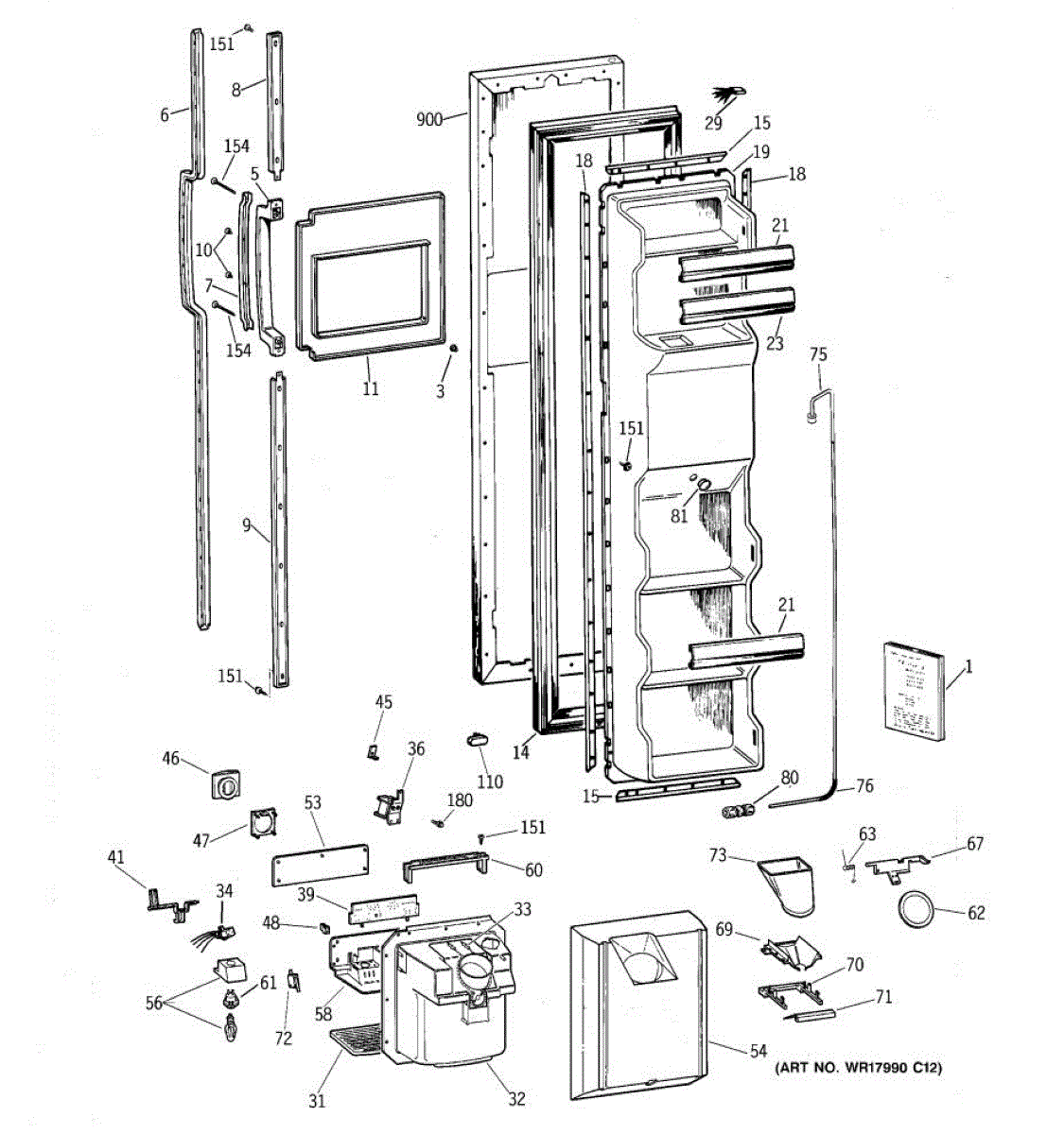 The Ice Door Assembly is an OEM part for GE refrigerators. It is integral to the ice dispenser system, controlling access to the ice chute. This component ensures the efficient delivery of ice cubes or crushed ice when activated and seals off the chute when not in use to maintain the freezer's temperature and prevent frost buildup.