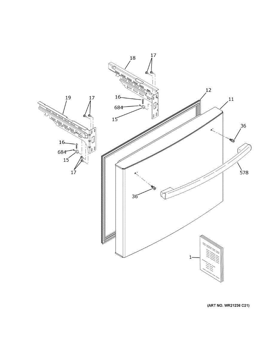 The Fastener Door Handle is an OEM component for GE refrigerators. This door handle provides a comfortable grip for accessing refrigerator shelves and bins. It attaches securely to the refrigerator door through durable metal fasteners.