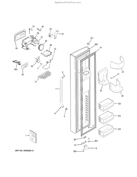 The Door Stop is an OEM component for GE refrigerator models. It is a small component located at the base of the refrigerator door that stops the door from opening past 90 degrees.