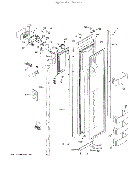 The Door Recess Spring is an OEM replacement part for GE side-by-side refrigerators. It sits within the icemaker door frame to control movement and allow smooth closing/opening of the access point.
