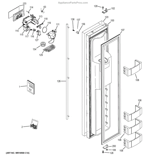 The Ice Door Assembly is an OEM part for GE refrigerators. It is integral to the ice dispenser system, controlling access to the ice chute. This component ensures the efficient delivery of ice cubes or crushed ice when activated and seals off the chute when not in use to maintain the freezer's temperature and prevent frost buildup.