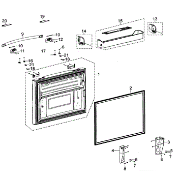 Complete freezer door assembly for bottom-mount refrigerators. Replaces damaged, cracked, or warped doors that no longer seal properly or show wear.
