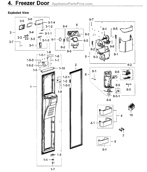 Lower guard assembly installs in the freezer compartment to protect and support the lower section. Replace if cracked, broken, or missing for stability.