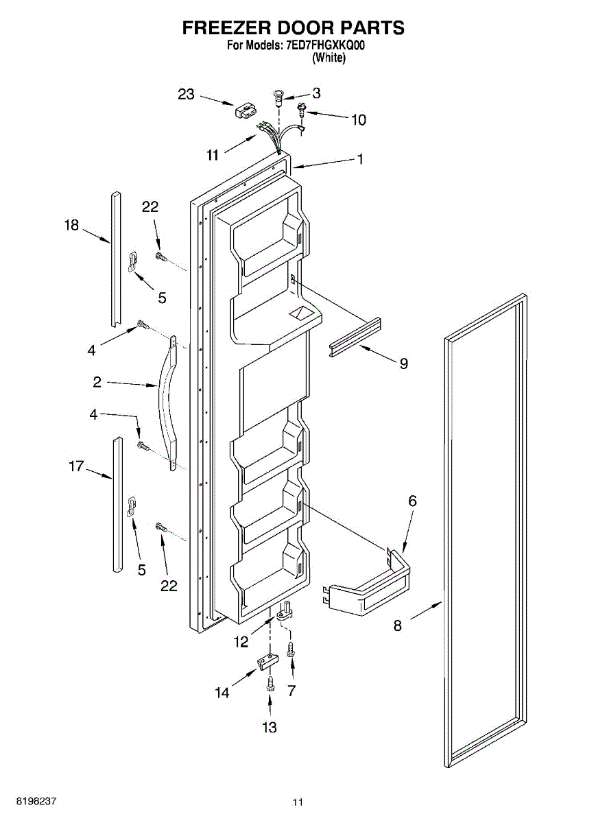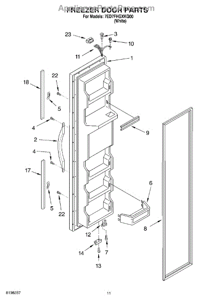 The Freezer Door Gasket is an OEM replacement part for Whirlpool refrigerators. It creates a tight insulating seal around the perimeter of the freezer door opening. The gasket helps maintain consistent sub-freezing temperatures inside by preventing cold air loss. Causes relate to natural compression fatigue over time, cracks developing with use, or accidental slicing/tears from sharp edges within the freezer. Symptoms of a compromised gasket include: