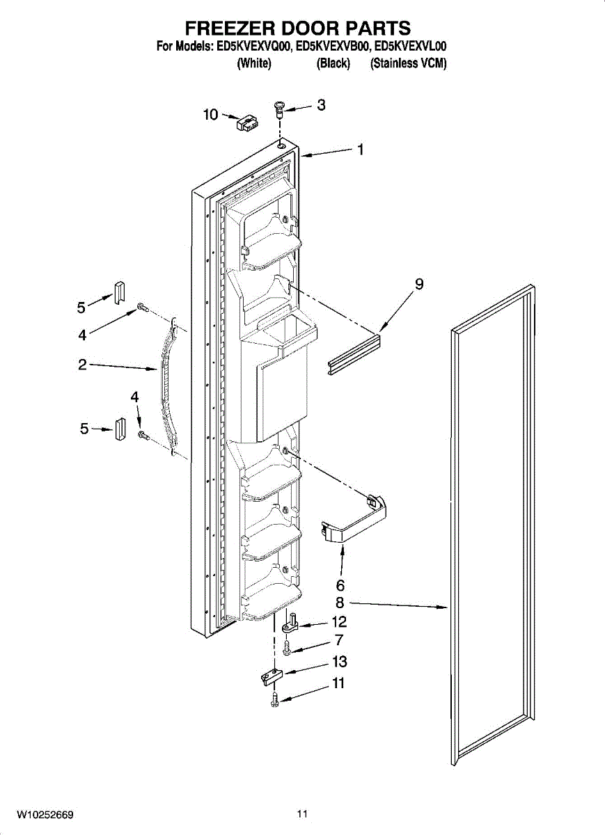 This freezer door shelf trim is the integrated retaining rail that secures items on the door bin. Replacing a cracked or missing rail restores a snug, reliable hold and keeps your freezer door storage tidy and usable.