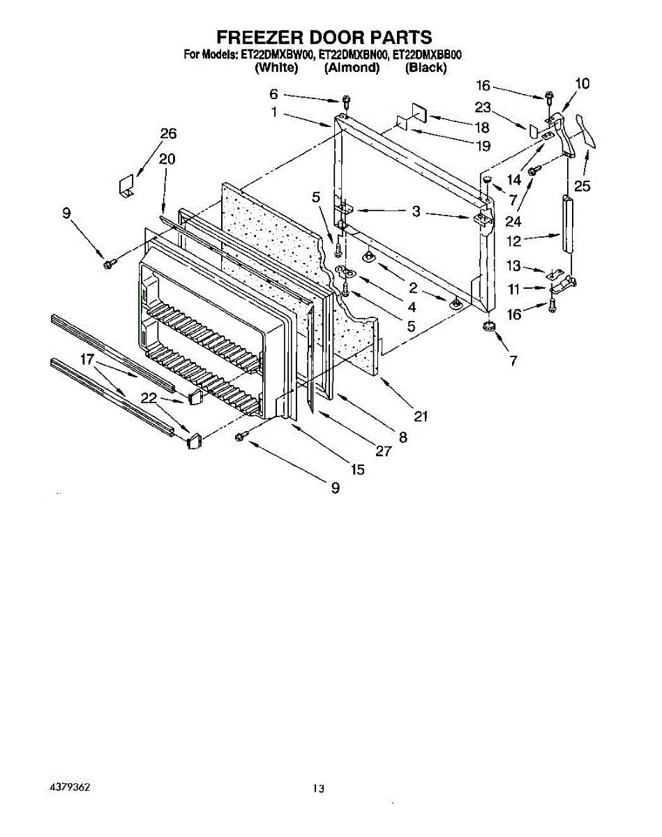 This freezer door gasket seals the door to the cabinet to keep cold air in and humid air out. Replacing a worn gasket restores a proper seal, helping maintain temperature and reducing frost and condensation around the door.