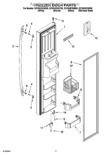 Mounts on the bottom of the freezer door to guide smooth opening and closing. Replace when cam is cracked, broken, or worn causing door misalignment.