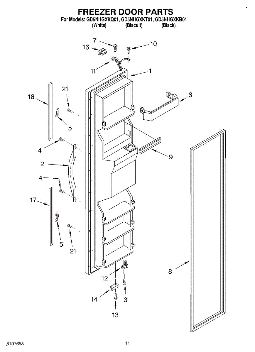 The Freezer Door Gasket is an OEM replacement part for Whirlpool refrigerators. It creates a tight insulating seal around the perimeter of the freezer door opening. The gasket helps maintain consistent sub-freezing temperatures inside by preventing cold air loss. Causes relate to natural compression fatigue over time, cracks developing with use, or accidental slicing/tears from sharp edges within the freezer. Symptoms of a compromised gasket include: