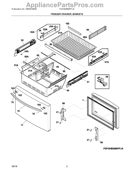 Freezer storage basket installs in the freezer compartment to organize frozen foods. Replace if cracked, broken, or missing to restore storage space.