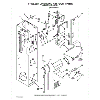 This fan scroll is the plastic housing that surrounds the evaporator fan in the freezer section. It directs air across the evaporator coils and into the ducts, helping your refrigerator move cold air evenly and maintain stable temperatures.