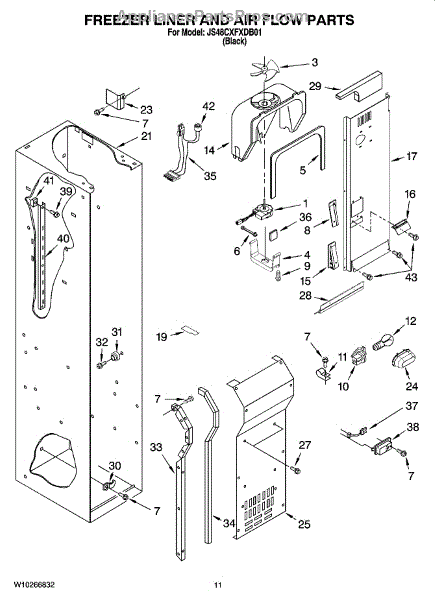 This fan scroll is the plastic housing that surrounds the evaporator fan in the freezer section. It directs air across the evaporator coils and into the ducts, helping your refrigerator move cold air evenly and maintain stable temperatures.