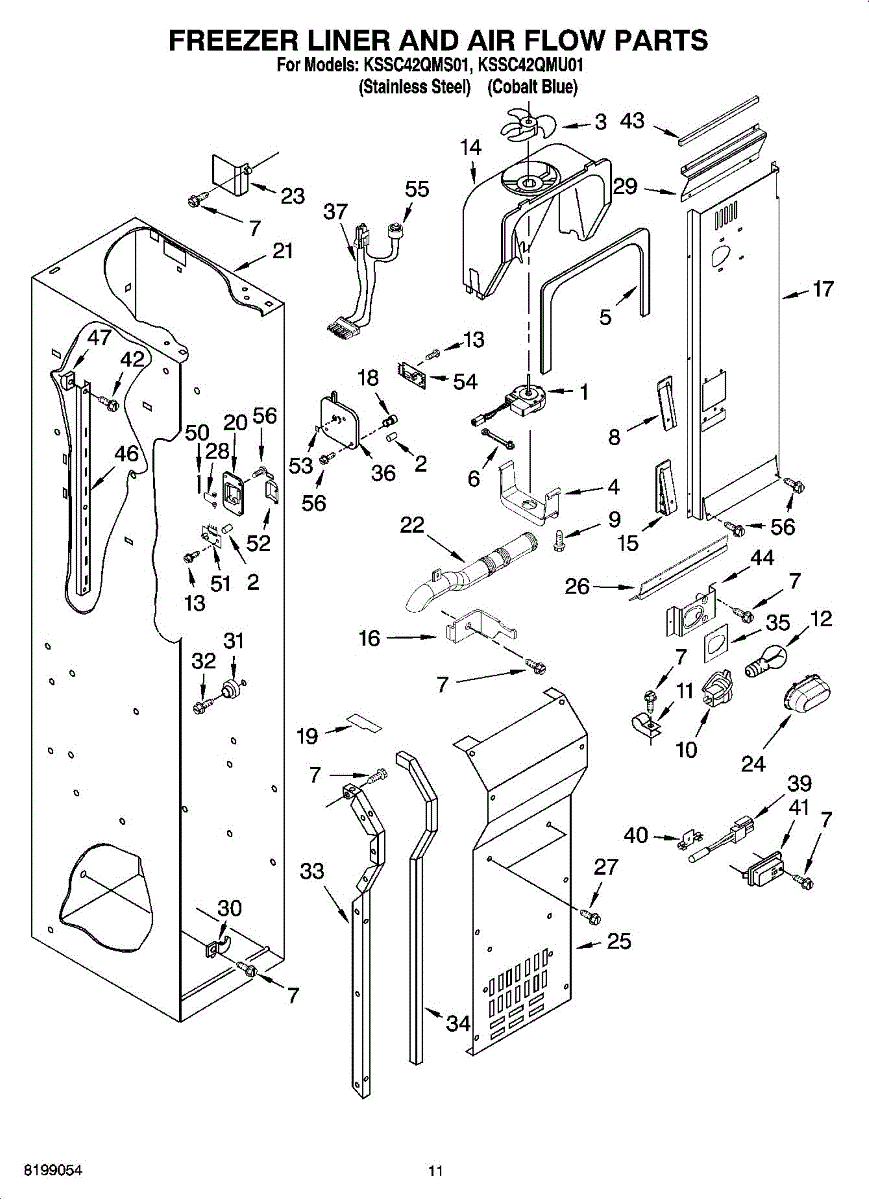 This fan scroll is the plastic housing that surrounds the evaporator fan in the freezer section. It directs air across the evaporator coils and into the ducts, helping your refrigerator move cold air evenly and maintain stable temperatures.