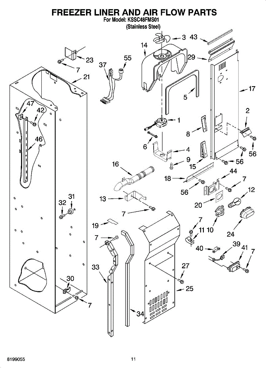 This fan scroll is the plastic housing that surrounds the evaporator fan in the freezer section. It directs air across the evaporator coils and into the ducts, helping your refrigerator move cold air evenly and maintain stable temperatures.