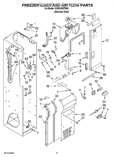 This fan scroll is the plastic housing that surrounds the evaporator fan in the freezer section. It directs air across the evaporator coils and into the ducts, helping your refrigerator move cold air evenly and maintain stable temperatures.
