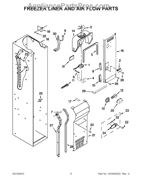 This fan scroll is the plastic housing that surrounds the evaporator fan in the freezer section. It directs air across the evaporator coils and into the ducts, helping your refrigerator move cold air evenly and maintain stable temperatures.