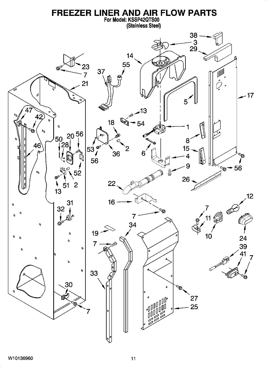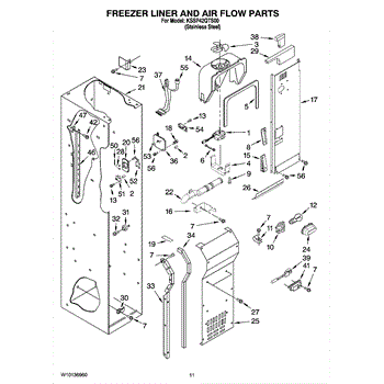 This fan scroll is the plastic housing that surrounds the evaporator fan in the freezer section. It directs air across the evaporator coils and into the ducts, helping your refrigerator move cold air evenly and maintain stable temperatures.