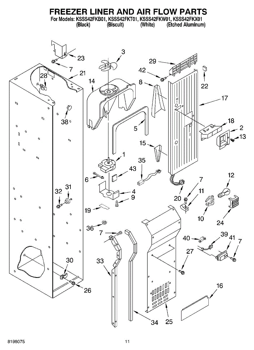 This fan scroll is the plastic housing that surrounds the evaporator fan in the freezer section. It directs air across the evaporator coils and into the ducts, helping your refrigerator move cold air evenly and maintain stable temperatures.