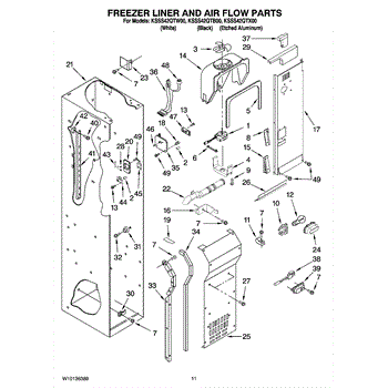 This fan scroll is the plastic housing that surrounds the evaporator fan in the freezer section. It directs air across the evaporator coils and into the ducts, helping your refrigerator move cold air evenly and maintain stable temperatures.