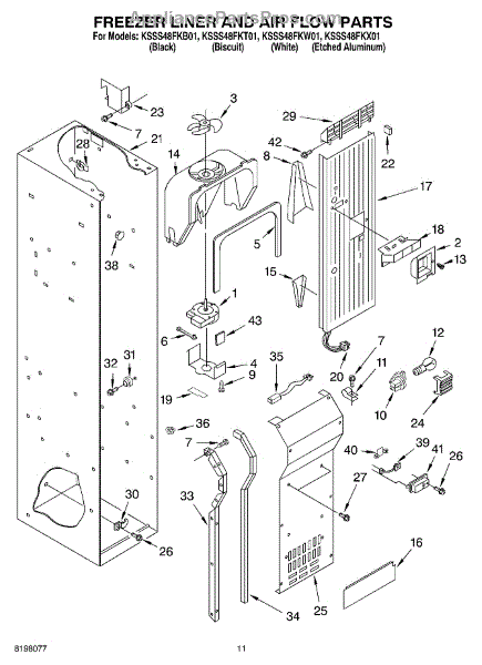 This fan scroll is the plastic housing that surrounds the evaporator fan in the freezer section. It directs air across the evaporator coils and into the ducts, helping your refrigerator move cold air evenly and maintain stable temperatures.