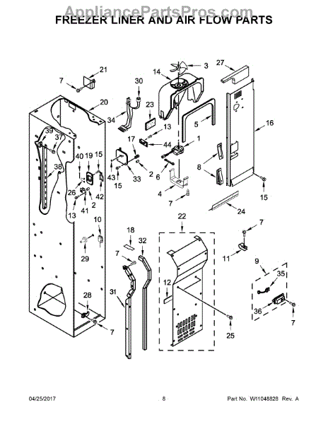 This fan scroll is the plastic housing that surrounds the evaporator fan in the freezer section. It directs air across the evaporator coils and into the ducts, helping your refrigerator move cold air evenly and maintain stable temperatures.