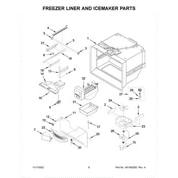 This ice container stores the ice your refrigerator makes and interfaces with the dispenser drive so cubes reach the door. Replacing a cracked or worn bin restores smooth, sanitary ice storage and dependable dispensing.