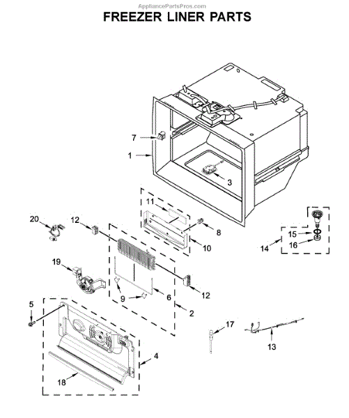 The Drain Funnel is an OEM part for Whirlpool French door refrigerators. It serves as the sloped plastic strainer that guides water from the evaporator coils s it into the drip pan below.