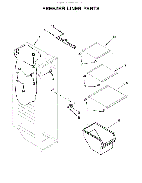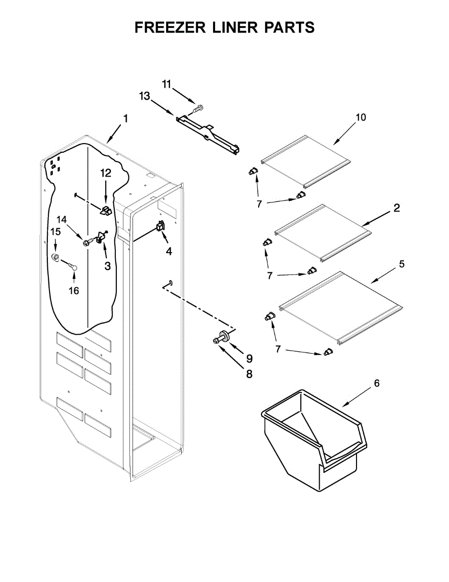 Replacement freezer door bin for side-by-side refrigerators. Restores storage space on the freezer door. Replaces cracked, broken, or missing bins.