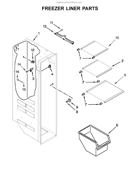 Replacement freezer door bin for side-by-side refrigerators. Restores storage space on the freezer door. Replaces cracked, broken, or missing bins.