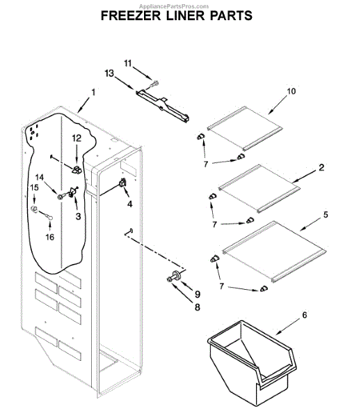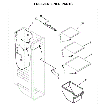 Replacement freezer door bin for side-by-side refrigerators. Restores storage space on the freezer door. Replaces cracked, broken, or missing bins.